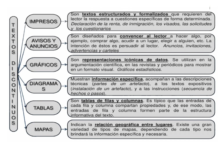 Es decir textos en los que la informacin se. Un texto discontinuo se puede definir como aquel texto que está organizado de manera gráfica y no lineal es decir que se lee desde diferentes planos porque los enunciados aparecen en i mágenes gráficos colores y fuentes. En un texto discontinuo la información está organizada en un formato diferente al del texto.